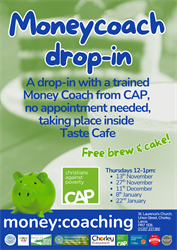 Come for an informal chat with a friendly trained Money Coach - coffee & cake are free!! Please whatsapp 07745 334 027 or email wellness@stlaurencechorley.co.uk to confirm the week this is available.