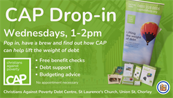 Each Wednesday we operate a CAP (Christians Against Poverty) debt centre drop-in, from 1-2pm . Free benefits checks are available, information and advice on how to budget and tackle debt is available too. If you want to tackle your debt - come along and find out how CAP can help. No appointment necessary.
